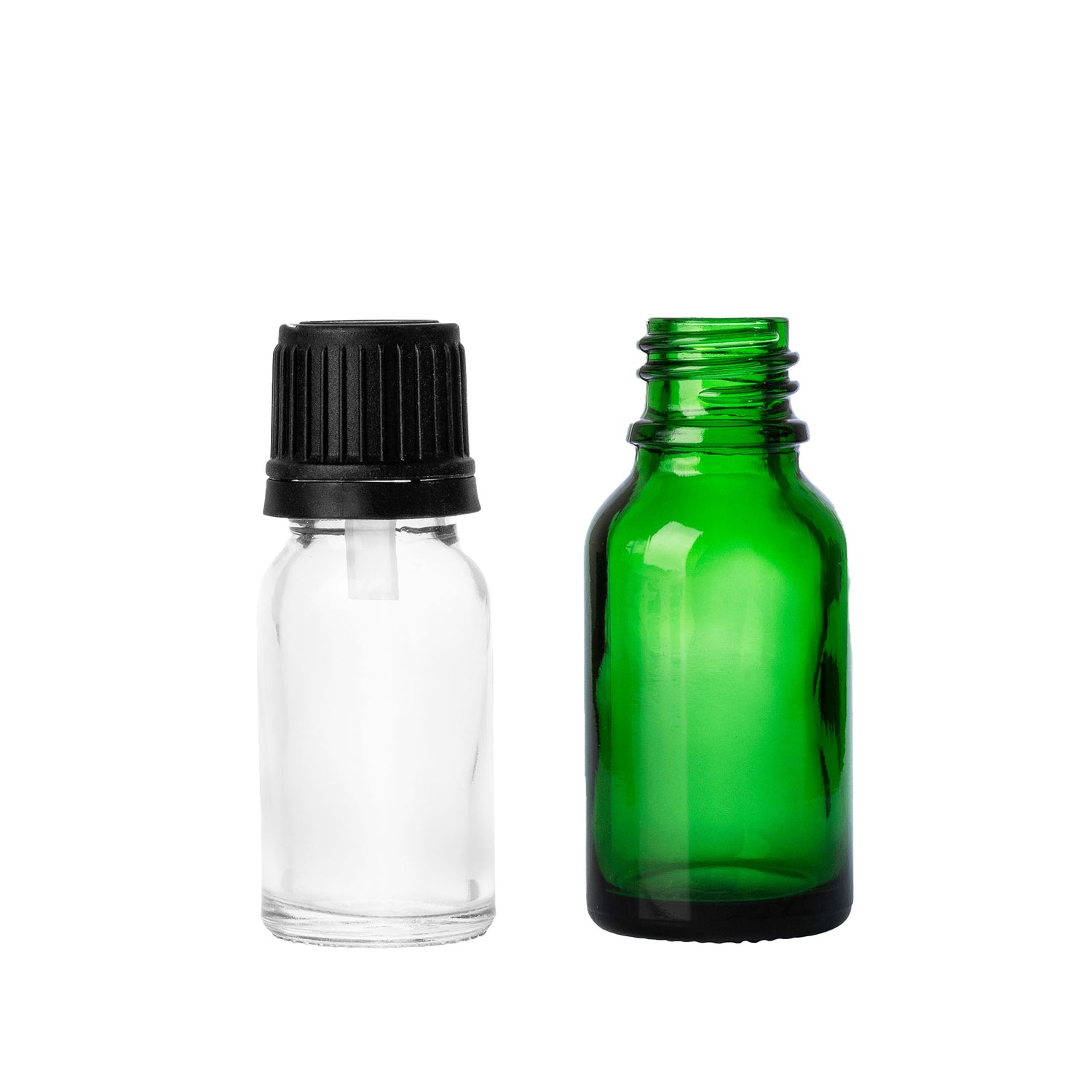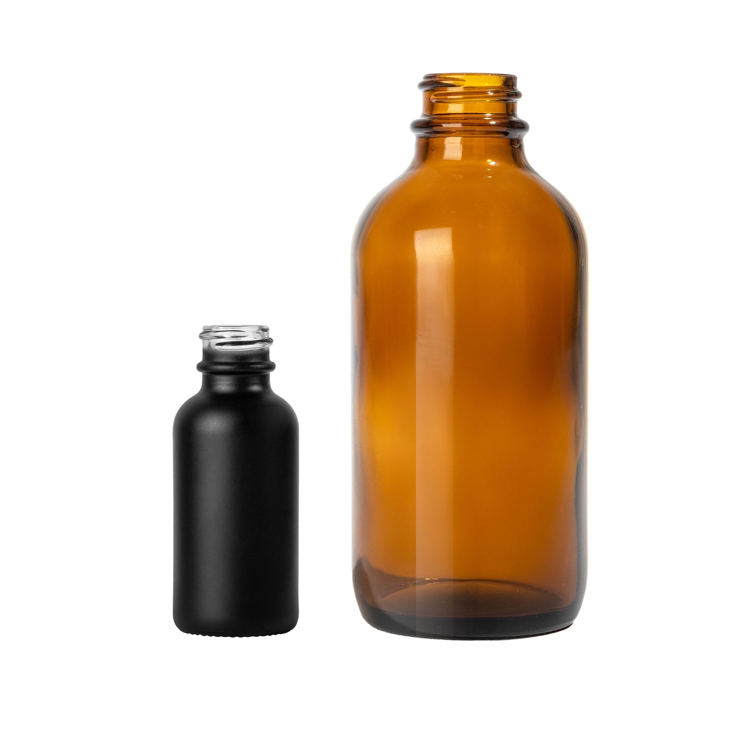 Euro round bottles, ideal for storing liquids such as essential oils, cosmetics, and fragrances, have a longer neck with a ring that allows for the use of tamper-evident caps and droppers.